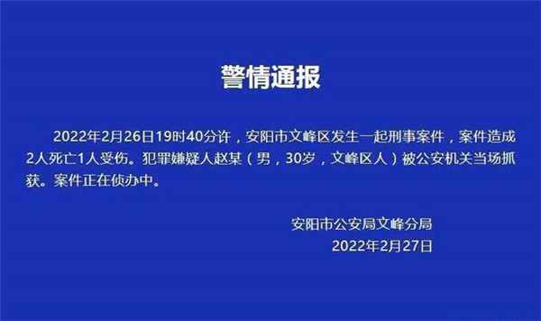 2月27日,安陽市公安局文峰分局發布警情通報稱,2022年2月26日19時40分許,安陽市文峰區發生一起刑事案件,案件造成2人死亡1人受傷。