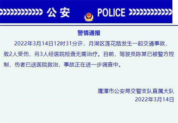 根據(jù)鷹潭交警發(fā)布的警情通報顯示,3月14日12時31分許,月湖區(qū)蓮花路發(fā)生一起交通事故,致2人受傷,另3人經(jīng)醫(yī)院檢查無需治療。目前,駕駛員陳某已被警方控制,傷者已送醫(yī)院救治,事故正在進一步調(diào)查中。