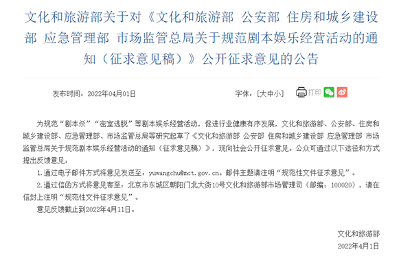 征求意見稿擬要求劇本娛樂經(jīng)營單位使用的劇本腳本應(yīng)當(dāng)設(shè)置適齡提示,標(biāo)明適齡范圍;設(shè)置的場景不適宜未成年人的,應(yīng)當(dāng)在顯著位置予以提示,并不得允許未成年人進(jìn)入。除國家法定節(jié)假日、休息日及寒暑假期外,劇本娛樂經(jīng)營活動(dòng)不得向未成年人提供。不得在居民樓、建筑物地下一層以下等地從事劇本娛樂經(jīng)營活動(dòng)。