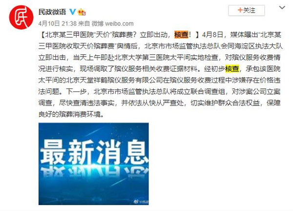經(jīng)初步核查,承包該醫(yī)院太平間的北京天堂祥鶴殯儀服務(wù)有限公司在殯儀服務(wù)收費(fèi)過程中涉嫌存在價(jià)格違法問題。下一步,北京市市場監(jiān)管執(zhí)法總隊(duì)將成立聯(lián)合調(diào)查組,對涉案公司立案調(diào)查,盡快查清違法事實(shí),并依法從快從嚴(yán)查處,切實(shí)維護(hù)群眾合法權(quán)益,保障良好的殯葬消費(fèi)環(huán)境。