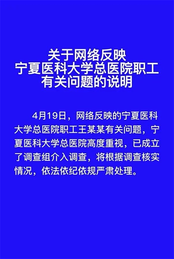 對此,寧夏衛健委于4月20日發布了一份情況說明,稱關于網絡反映的寧夏醫科大學總醫院職工王某某有關問題,寧夏醫科大學總醫院高度重視,已成立了調查組介入調查,將依據調查核實情況,依法依紀依規嚴肅處理。