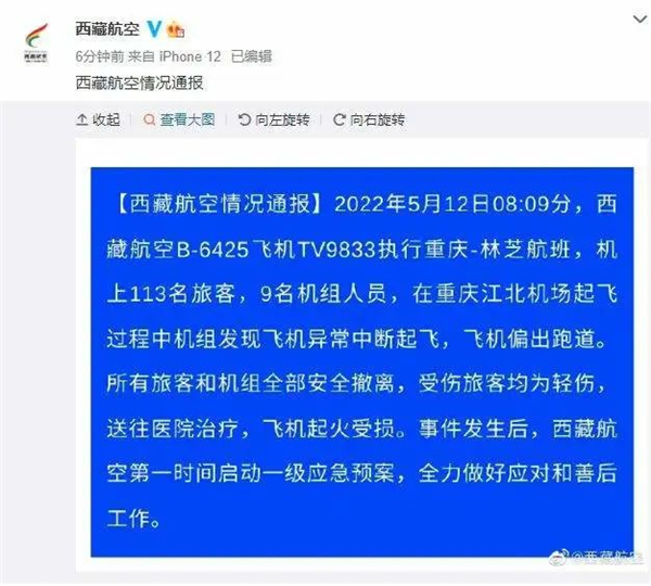 5月12日8時許,西藏航空一航班在重慶江北國際機場起飛時,偏出跑道后起火,目前已有人員受傷,并被送往醫院救治。