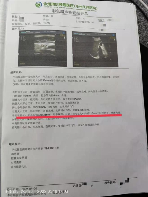 5月6日,唐先生來到永州天鴻醫院體檢。當時醫生告訴他,需要一周后拿體檢報告,"他們說是正規醫院,體檢結果還需要經過醫生審核才能發給我。"唐先生說,"我覺得挺好,感覺蠻靠譜的。"5月12日,唐先生拿到了自己的體檢報告,當時他粗略看了一眼,沒發現有什么大問題。隨后,他將體檢報告發給妻子。半小時后,妻子打來電話,說體檢報告有問題。