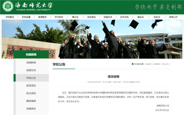5月24日下午,海南師范大學已發布通報,表示學校已介入調查,已迅速成立聯合調查組,正在對相關問題進行核查。如果查實有違反師德師風問題的情況,學校一定嚴肅處理,絕不姑息。