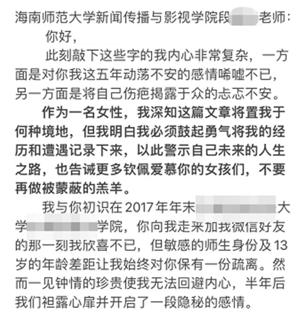 該博主在文中介紹,2019年7月,段某某調入海南師范大學,但2021年3月,她意外得知段某某在與自己交往時還與一位女學生發生過性關系;2021年7月,她又得知,2020年10月至2021年2月間,段某某“與海師大一名女學生有著超出師生的非正當關系”;今年4月22日,她再次得知段某某“去年到現在斷斷續續又交往了一個至今不承認是女朋友的海師女學生,并跟她保持親密關系”。
