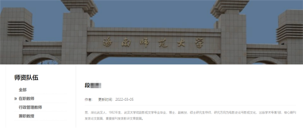 據海南師范大學新聞傳播與影視學院官網顯示,段某某為在職教師,其個人介紹為:男,湖北武漢人,1982年生,博士,副教授,碩士研究生導師。