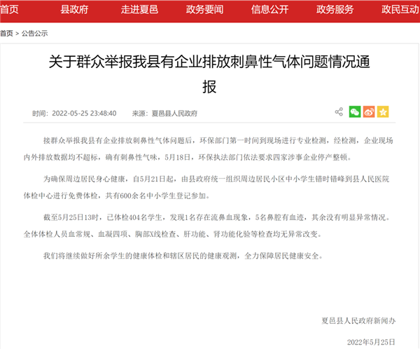 對(duì)此,河南省夏邑縣人民政府網(wǎng)站5月25日發(fā)布《關(guān)于群眾舉報(bào)我縣有企業(yè)排放刺鼻性氣體問題情況通報(bào)》: