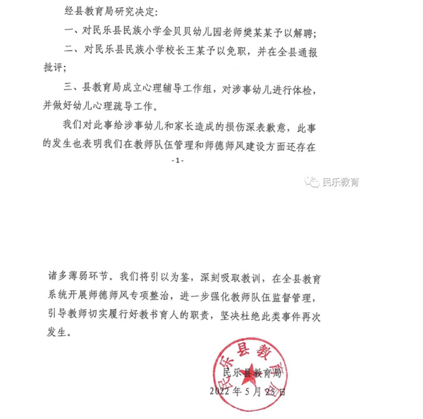 民樂縣教育局表示,對此事給涉事幼兒和家長造成的損傷深表歉意,此事的發生也表明當地在教師隊伍管理和師德師風建設方面還存在諸多薄弱環節。民樂縣教育局表示將引以為鑒,深刻吸取教訓,在全縣教育系統開展師德師風專項整治,進一步強化教師隊伍監督管理,引導教師切實履行好教書育人的職責,堅決杜絕此類事件再次發生。