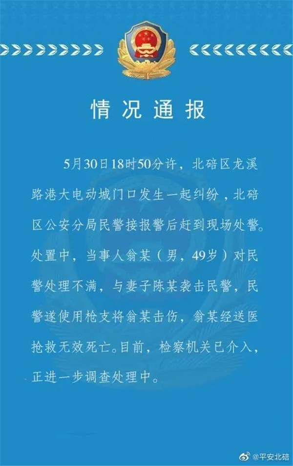 處置中,當事人翁某(男,49歲)對民警處理不滿,與妻子陳某襲擊民警,民警遂使用槍支將翁某擊傷,翁某經送醫搶救無效死亡。目前,檢察機關已介入,正進一步調查處理中。