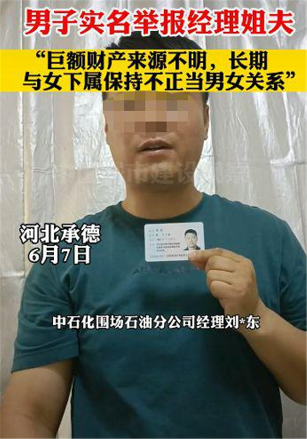 近日,一男子手持身份證,實名舉報其姐夫、中國石化銷售股份有限公司(以下簡稱"中石化")河北承德圍場石油分公司經(jīng)理劉某東,此事引發(fā)網(wǎng)友關注。