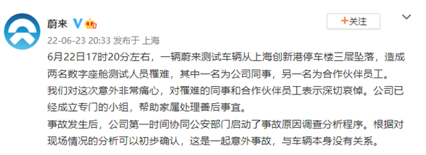 6月22日17時20分左右,一輛蔚來測試車輛從上海創新港停車樓三層墜落,造成兩名數字座艙測試人員罹難,其中一名為公司同事,另一名為合作伙伴員工。