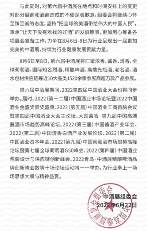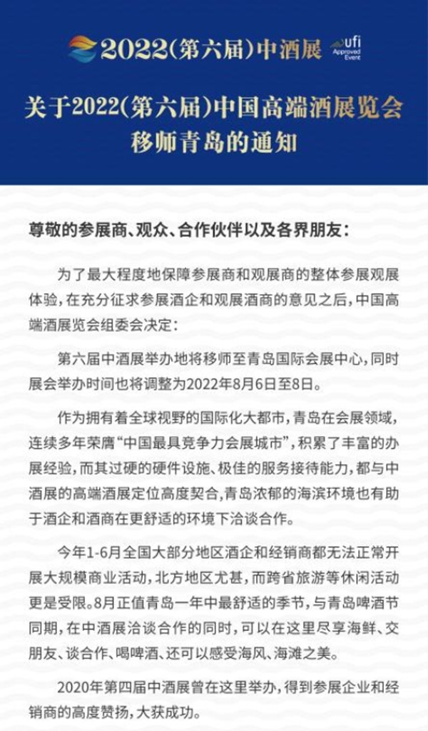 6月22日晚,中酒展組委會(huì)發(fā)布公告,為了最大程度地保障參展商和觀展商的整體參展觀展體驗(yàn),在充分征求參展酒企和觀展酒商的意見之后,中國(guó)高端酒展覽會(huì)組委會(huì)決定: