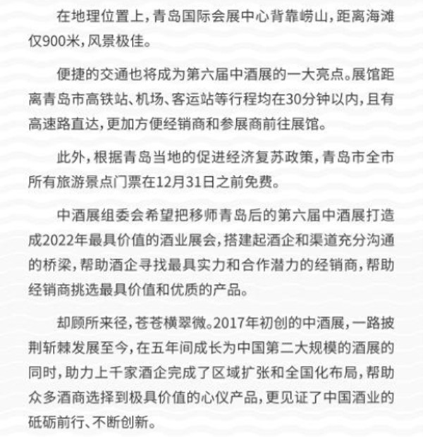 而即將于8月6日-8日,在山東青島盛大舉辦的2022第六屆中酒展,可謂天時(shí)、地利、人和,備受業(yè)界期待。