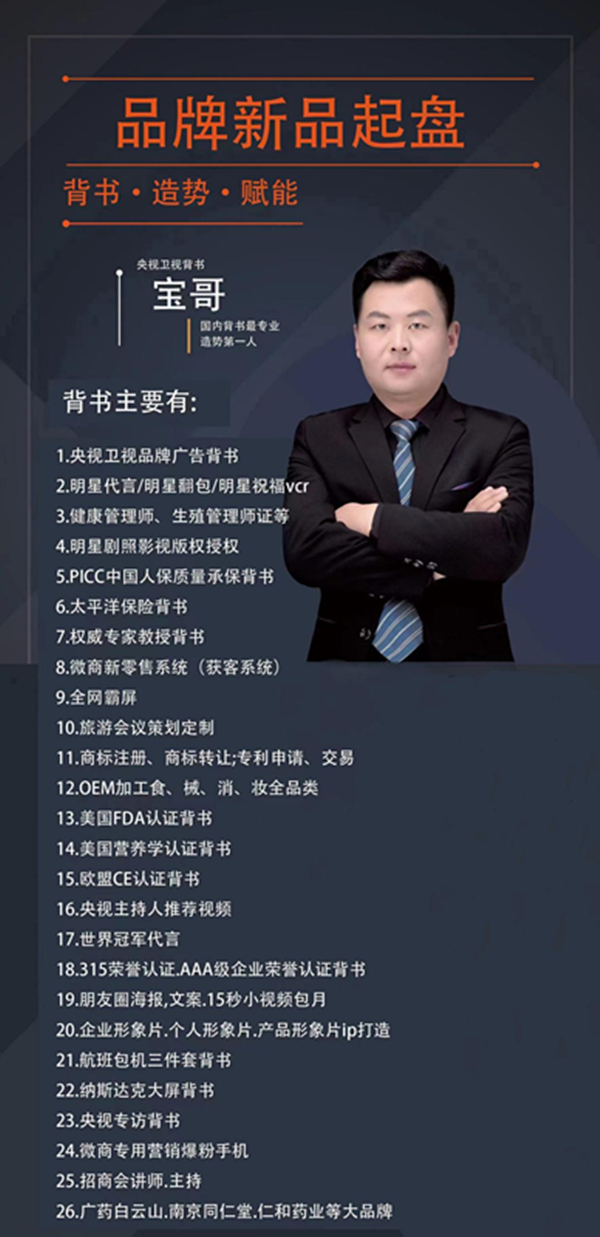 我是寶哥,您最值得信賴的背書造勢賦能專家,我們合作的話,我們是最懂營銷最懂新零售的服務商,我們不單純是做媒體發布的服務商,我們主要從六大板塊: