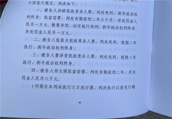 2022年7月7日,云南省西雙版納傣族自治州中級人民法院一審公開宣判被告人洪嶠、張晨光、曹澤青故意殺人,被告人洪嶠、祁文強盜竊一案,對洪嶠以故意殺人罪判處死刑,剝奪政治權利終身,以盜竊罪判處有期徒刑二年六個月,并處罰金人民幣一萬元,數罪并罰,決定執行死刑,剝奪政治權利終身,并處罰金人民幣一萬元;對張晨光、曹澤青分別以故意殺人罪判處死刑,緩期二年執行,剝奪政治權利終身。