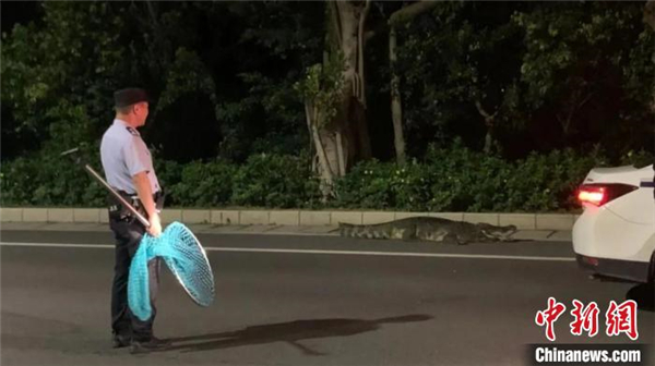 7月2日凌晨,一民眾駕車途經佛山市南海區(qū)西樵鎮(zhèn)樵高路過境路路段時,發(fā)現(xiàn)一只大鱷魚趴在路旁,不時緩慢爬行,該民眾嚇得當即報警求助。