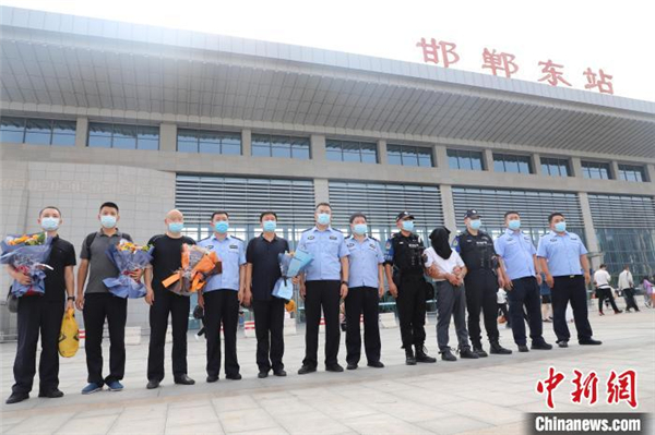 圖為犯罪嫌疑人(右四)被押解回邯鄲。 崔巖 攝