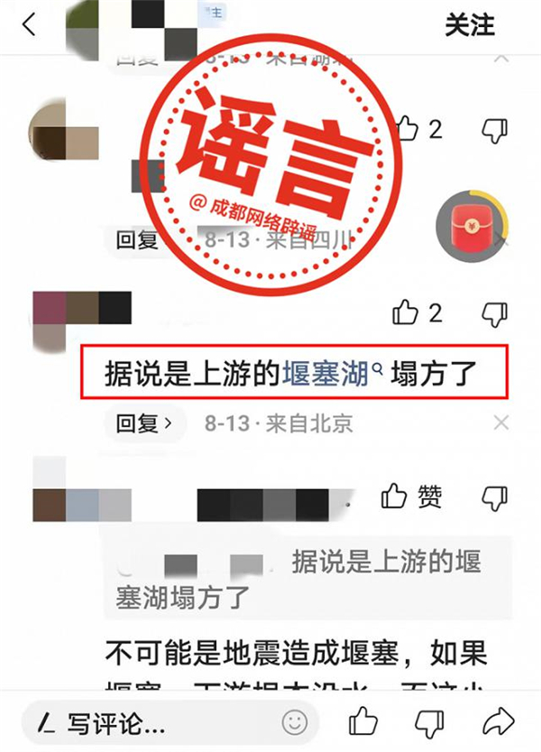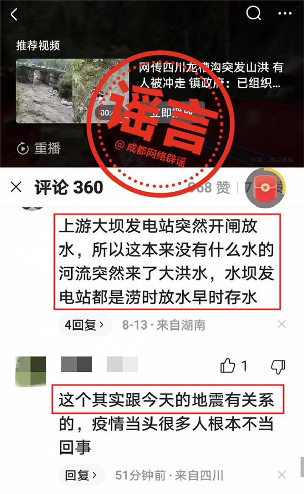 8月13日,成都彭州市龍漕溝突發山洪,造成游玩群眾傷亡引全網關注,在大家為被困群眾擔心和祈禱的同時,卻有個別網民不斷散布"上游大壩發電站突然開閘放水引發山洪""山洪是由地震形成的堰塞湖塌方導致"等言論博取眼球。
