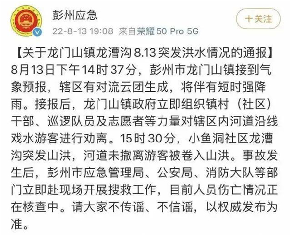 8月13日19點08分,彭州市應急管理局官方微博"彭州應急"就"龍門山鎮龍漕溝突發洪水"一事發布通報,提及事故原因為當日下午該轄區有對流云團生成,伴有短時強降雨,從而引發龍漕溝區域突發山洪,導致群眾被困。"通報"全文如下: