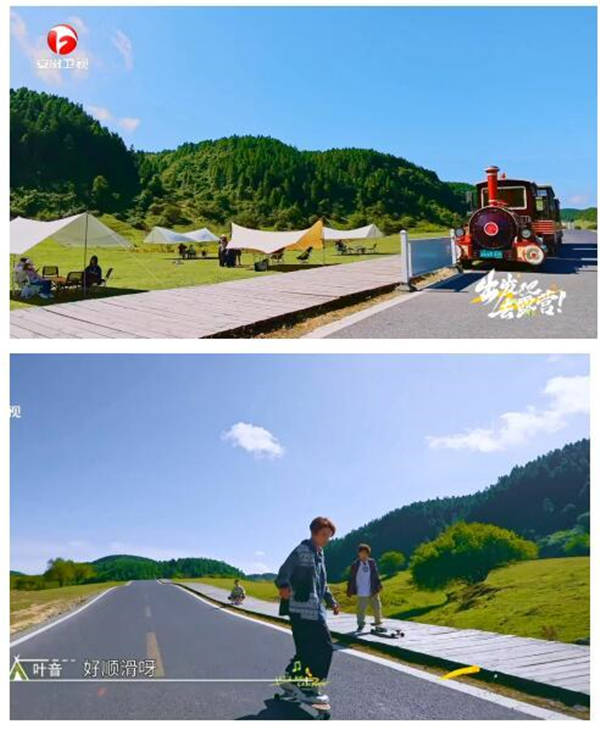 在仙女山最美公路上,葉音玩性大發,偷懶式“坐滑板”“躺滑板”畫風奇特;王晨藝則化身滑板少年,在高低起伏的公路上滑行又帥又酷!
