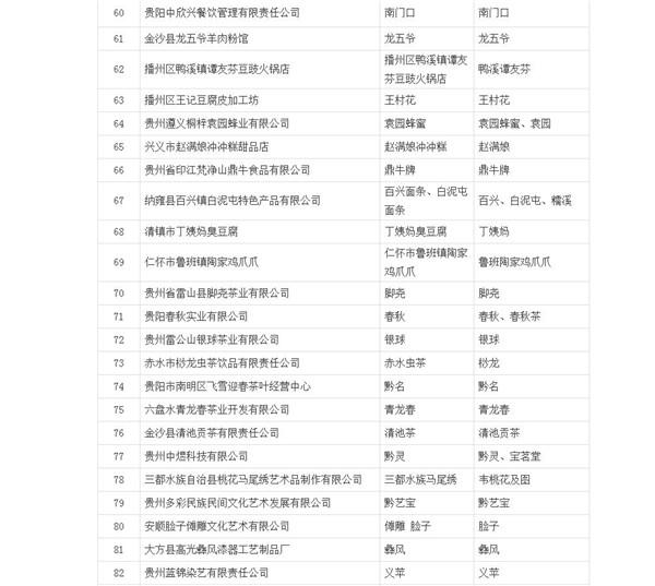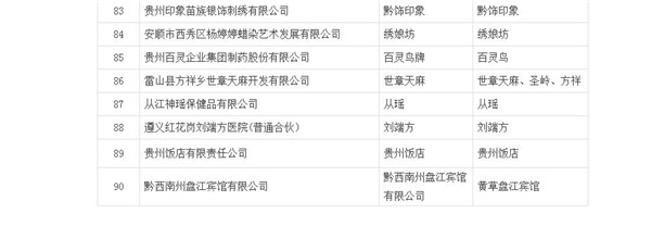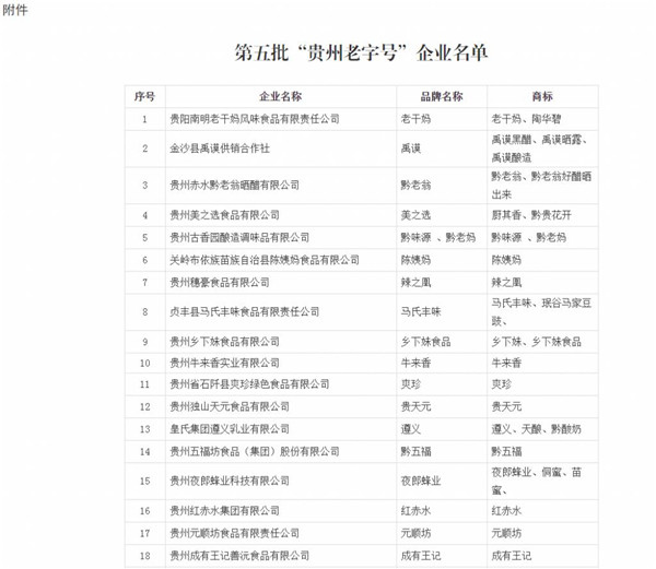 為弘揚貴州優(yōu)秀傳統(tǒng)文化,進(jìn)一步推進(jìn)我省老字號品牌保護(hù)和發(fā)展,壯大"貴州老字號"企業(yè),推動老字號品牌振興,根據(jù)《省商務(wù)廳關(guān)于開展第五批"貴州老字號"認(rèn)定申報工作的通知》要求,經(jīng)企業(yè)申報、市(州)商務(wù)部門初審?fù)扑]、專家評審、社會公示等程序,經(jīng)省商務(wù)廳辦公會同意,決定認(rèn)定貴陽南明老干媽風(fēng)味食品有限責(zé)任公司(老干媽)等90家企業(yè)(品牌)為第五批"貴州老字號"。(名單詳見附件)