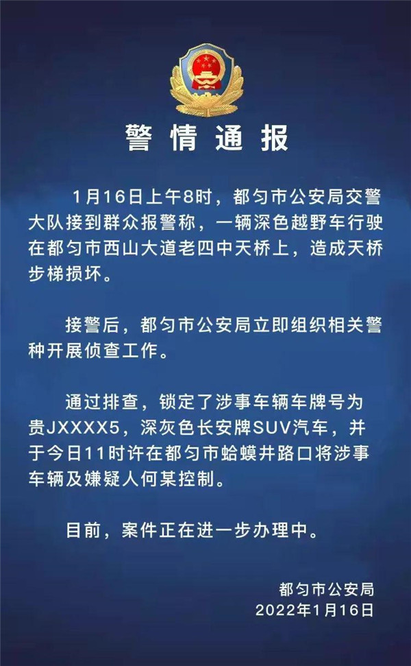 目前,都勻市公安局已將涉事車輛及嫌疑人何某控制,案件正在進一步辦理中。