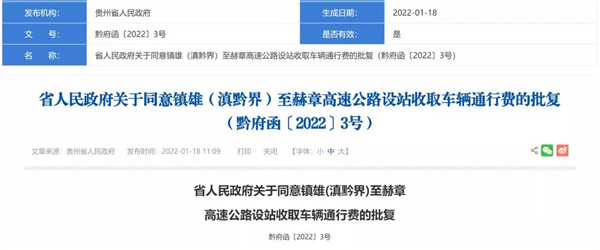 你們《關于鎮雄(滇黔界)至赫章高速公路設站收取車輛通行費有關事宜的請示》(黔交呈〔2022〕4號)收悉。經研究,現批復如下: