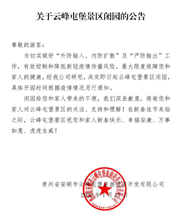 為切實做好"外防輸入、內防擴散"及"嚴防輸出"工作,有效控制和降低新冠疫情傳播風險,最大限度保障您和家人的健康,經我公司研究,決定即日起云峰屯堡景區閉園,具體開園時間根據疫情情況另行通知。閉園給您和家人帶來的不便,我們深表歉意,感謝您和家人對云峰屯堡景區的關注、支持和理解!在新春佳節來臨之際,云峰屯堡景區祝您和家人新春快樂、幸福安康、萬事如意、虎虎生威!