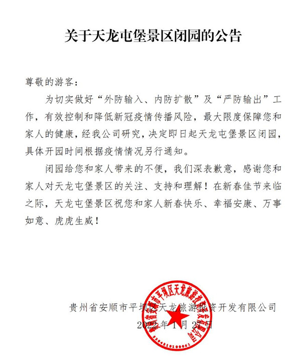 為切實做好"外防輸入、內防擴散"及"嚴防輸出"工作,有效控制和降低新冠疫情傳播風險,最大限度保障您和家人的健康,經我公司研究,決定即日起天龍屯堡景區閉園,具體開園時間根據疫情情況另行通知。閉園給您和家人帶來的不便,我們深表歉意,感謝您和家人對天龍屯堡景區的關注、支持和理解!在新春佳節來臨之際,天龍屯堡景區祝您和家人新春快樂、幸福安康、萬事如意、虎虎生威!