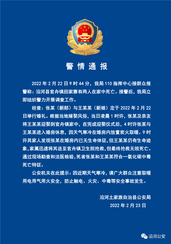 經查:張某(新郎)與王某某(新娘)定于2022年2月22日舉行婚禮。根據當地嫁娶風俗,當日凌晨1時許,張某及親友將王某某迎娶到官舟鎮家中,在完成迎娶儀式后,4時許張某與王某某進入婚房休息,因天氣寒冷在婚房內放置炭火取暖。9時許其家人發現張某在婚房內已無生命體征,但王某某仍有生命跡象,家屬迅速將其送至官舟鎮衛生院搶救,但最終搶救無效死亡。通過現場勘查和法醫檢驗,死者張某和王某某符合一氧化碳中毒死亡特征。