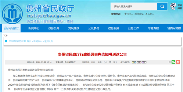 經立案調查,貴州省農村開發扶貧促進會、貴州省農產品產業商會、貴州省暖心企業幫扶公益協會、貴州省農產品冷鏈物流商會、貴州省企業安全文化促進會、貴州省煙花爆竹生產協會、貴州省尚行心理健康研究中心、貴州阿水野戰運動俱樂部、貴州中小學雙快作文教育研究院等9家社會組織未參加2019年、2020年社會組織年度檢查的行為,違反了《社會團體登記管理條例》《民辦非企業單位登記管理暫行條例》有關規定,依據《社會團體登記管理條例》第三十條、《民辦非企業單位登記管理暫行條例》第二十五條,本機關對你們擬作出撤銷登記的行政處罰。