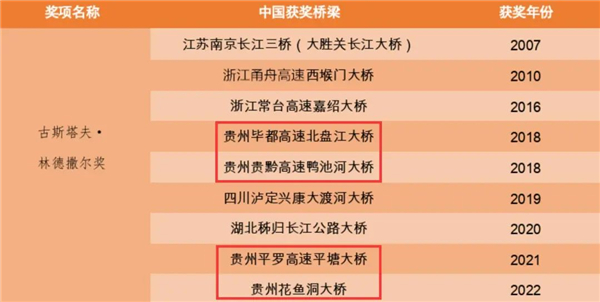 2018年起,貴州橋4次獲得該項(xiàng)大獎(jiǎng),成為獲該獎(jiǎng)項(xiàng)最多的省份。世界高橋前100位,近半在貴州。