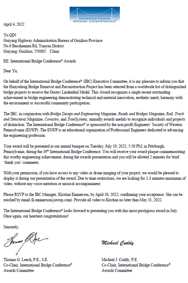 國際橋梁大會(huì)(IBC)發(fā)送的確認(rèn)獲獎(jiǎng)的郵件