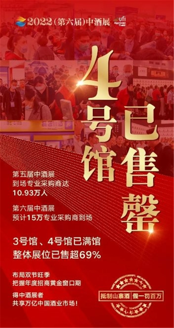 日前,2022第六屆中酒展展位已售69%,3號館、4號館售罄,優(yōu)質(zhì)展位所剩不多,趕緊來搶訂吧!