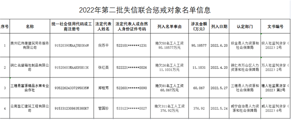 2022年貴州省第二季度拖欠農民工工資失信聯合懲戒對象名單
