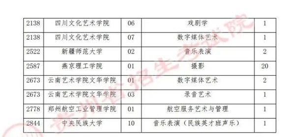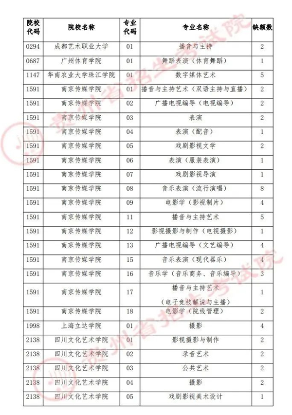 部分藝術類梯度志愿本科院校缺額情況統計表: