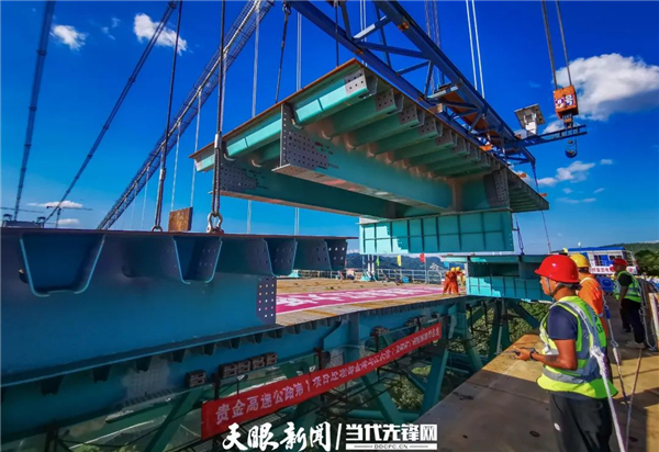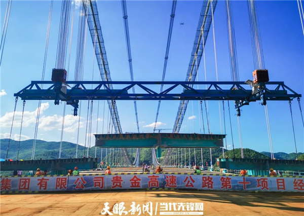 省交通運輸廳黨委委員、副廳長韓劍波在合龍儀式上表示,貴州省特殊的地形地貌,為各式各樣橋梁建設(shè)提供了廣闊空間,贏得了“世界橋梁看中國,中國橋梁看貴州”的美譽。目前,全省建成具有代表性的公路特殊結(jié)構(gòu)橋梁44座,世界高橋前100名中有51座在貴州、前10名中有4座在貴州,全國獲得“古斯塔夫·林得撒爾獎”的9座橋梁有4座在貴州,堪稱世界“橋梁博物館”。“金烽烏江大橋具有索股數(shù)量多、活載占比大等特點,再次為貴州交通發(fā)出好聲音、展示新形象。大橋鋼桁梁成功合攏,標志著大橋建設(shè)又邁出了關(guān)鍵性的一步,進入橋面施工的沖刺階段,為貴金高速建成通車打下了堅實基礎(chǔ)。”
