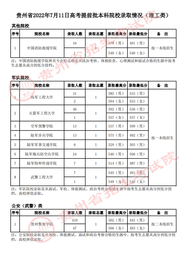 7月11日,貴州省招生考試院公布了當日高考提前批本科院校的錄取情況,具體如下: