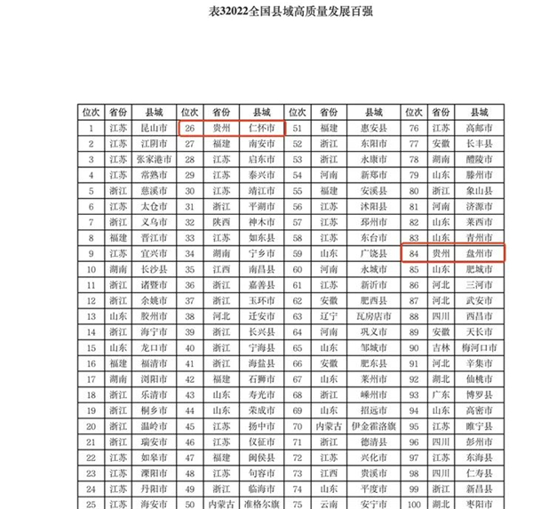 日前,《中國縣域高質量發展報告2022》對外發布,貴州省仁懷市和盤州市入選2022年全國縣域高質量發展百強縣,分別位居第26位、84位。