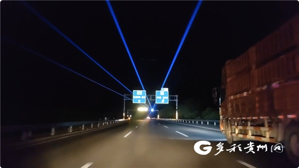 日前,貴陽高速交警啟用了一套激光束設備,提醒司機夜間謹慎駕駛。