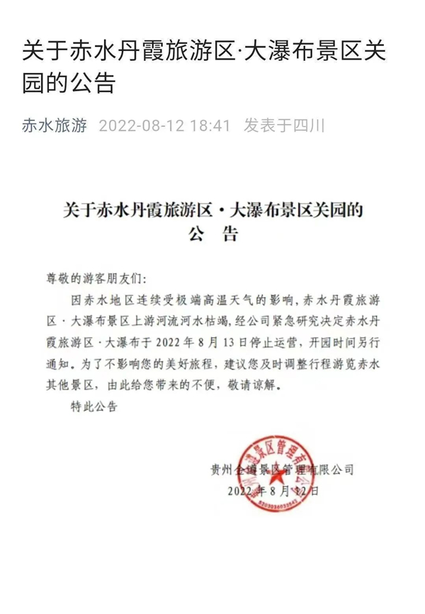 8月12日,貴州赤水旅游發(fā)展股份有限公司官方微信公眾號“赤水旅游”發(fā)布公告稱:因赤水地區(qū)連續(xù)受極端高溫天氣的影響,赤水丹霞旅游區(qū)·大瀑布景區(qū)上游河流河水枯竭,經(jīng)貴州金遵景區(qū)管理有限公司緊急研究決定赤水丹霞旅游區(qū)·大瀑布于2022年8月13日停止運(yùn)營,開園時間另行通知。