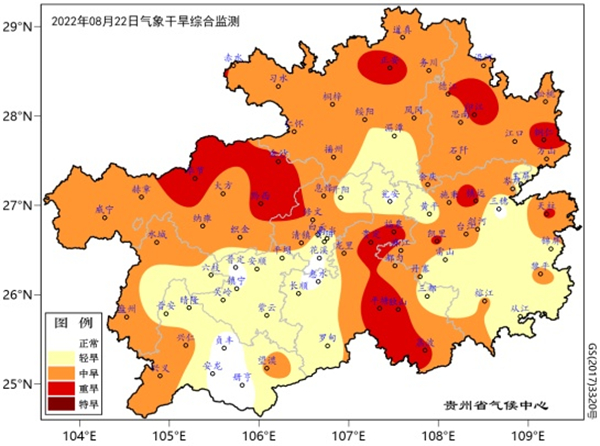 記者從貴州省氣象局了解到,據8月22日氣象干旱綜合監測,貴州省出現重旱的有15個縣(市、區)(七星關、黔西、金沙、正安、德江、印江、碧江、天柱、鎮遠、凱里、福泉、貴定、平塘、獨山、荔波),中旱39個縣(市、區),輕旱19個縣(市、區)。中旱以上區域主要分布在畢節市、遵義市大部、銅仁市、黔東南州北部及局地、黔南州中東部、黔西南州西部和東部、六盤水市西部等地。