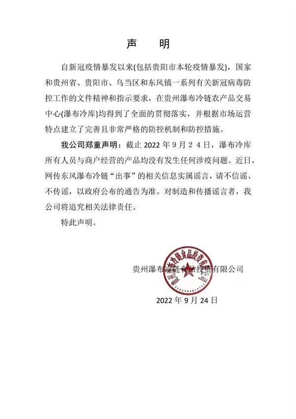 該公司鄭重聲明:截至2022年9月24日,瀑布冷庫所有人員與商戶經營的產品均沒有發(fā)生任何涉疫問題。近日,網傳東風瀑布冷鏈“出事”的相關信息實屬謠言,請不信謠、不傳謠,以政府公布的通告為準。