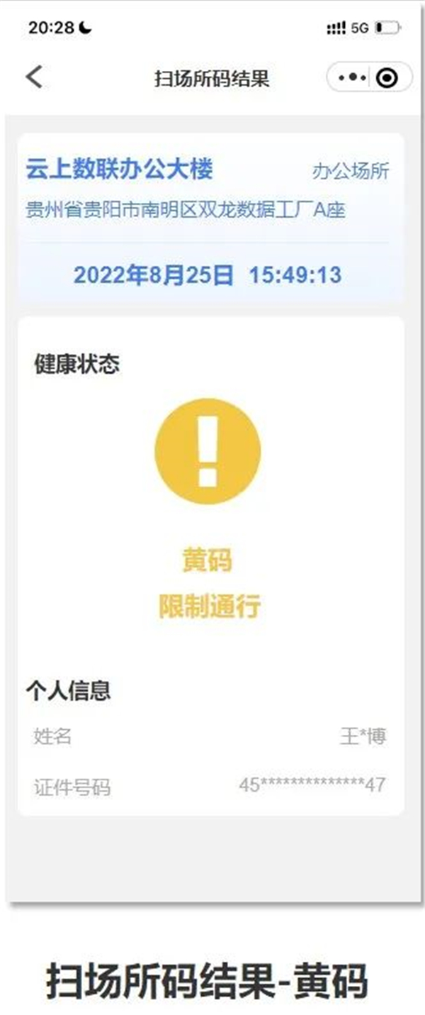 掃場所碼顯示為黃碼人員,按健康碼黃碼人員進行管理,黃碼人員請立即向