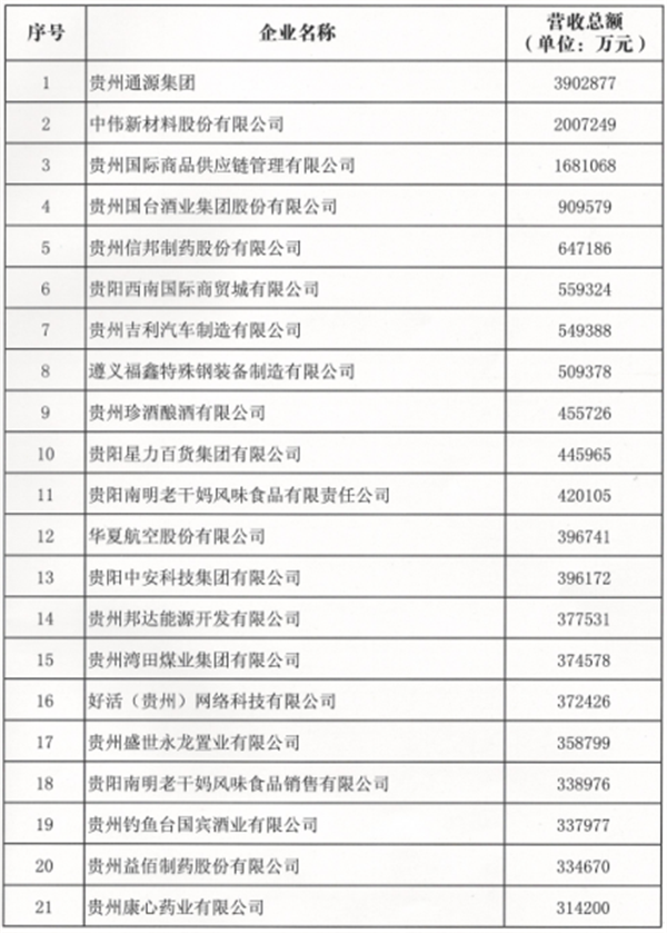 此外,今年首次發布的“貴州制造業民營企業20強榜單”顯示,制造業民營企業20強入圍門檻達到20.01億元。中偉新材料股份有限公司、貴州國臺酒業集團股份有限公司、貴州信邦制藥股份有限公司位列前三。