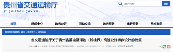 11月10日,貴州省交通運(yùn)輸廳網(wǎng)站發(fā)布《省交通運(yùn)輸廳關(guān)于貴州省荔波至河池(黔桂界)高速公路初步設(shè)計(jì)的批復(fù)》。