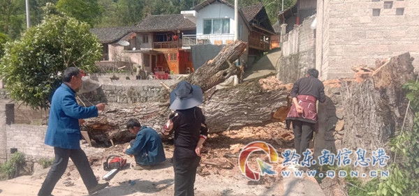 在清理過程中,江古村支兩委組織洞尾片區群眾16人,分成兩個小組。一組負責做好道路封閉工作,疏散附近村民;另一組負責清理危樹,把樹枝放置在安全區域。經過村干的組織協調,群眾共同努力清理了危樹5顆,為周邊村民排除了安全隱患。