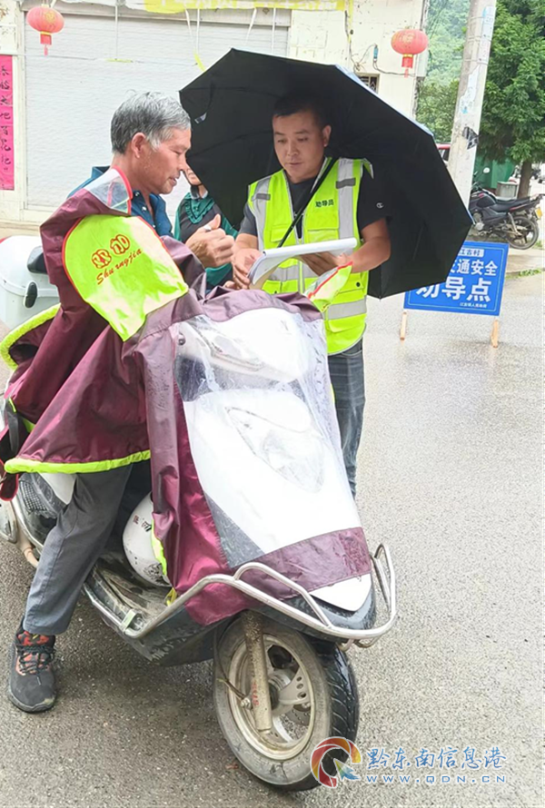 時遇小雨,勸導人員毫不退縮,仍堅守崗位。他們分組協作,主要對不文明行為進行勸導,提醒戴好安全帶、安全帽,無牌照車輛勸導不要上路并引導如何辦理牌照等情況。本次勸導未戴安全帽8人,未系安全帶10人,無牌照4人,并借機對其宣傳交通安全知識。