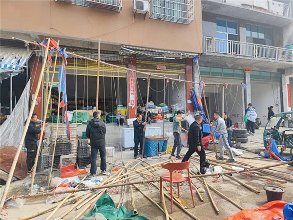 民生產生活存在著巨大的安全隱患,加之商戶占道經營雞鴨,致使周邊環境變得“臟、亂、差、臭”,嚴重影響鎮容鎮貌。下江鎮城管執法大隊巡查到此處時,立即與違搭建筑居民進行了交流溝通,向其宣傳法律法規,全面分析違規搭建的利弊。最終,在工作人員耐心勸導一下,居民和工作人員通力合作對違規搭建雨蓬進行拆除。經過一上午的時間,下江農貿市場一帶違規搭建雨蓬和占道經營等構筑物全部整治完畢,恢復了寬敞而又整潔的道路。