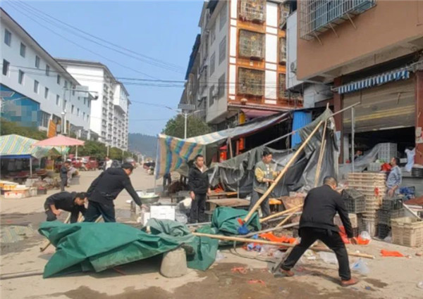 從江縣下江鎮組織干部職工對下江農貿市場一帶違規搭建雨蓬和占道經營等構筑物進行整治拆除,看到整治后的效果,附近居民點頭稱贊。